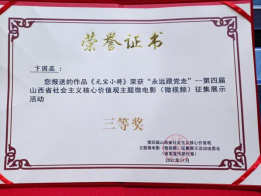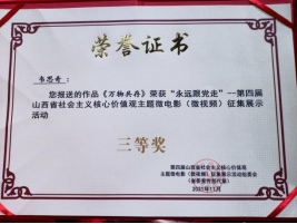 “永远跟党走”——第四届山西省社会主义核心价值观主题微电影(微视频)征集展示活动由山西省委宣传部、省委网信办、省教育厅、省广电局、山西广播电视台联合举办。本次活动共收到省内外作品721部,有28部优秀作品脱颖而出,其中一等奖3部、二等奖6部、三等奖9部、优秀奖10部。