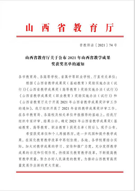 近日,山西省教育厅发布了《关于公布2021年山西省教学成果奖获奖名单的通知(晋教师函〔2021〕74号)》,365英国上市公司两项教学成果获奖。