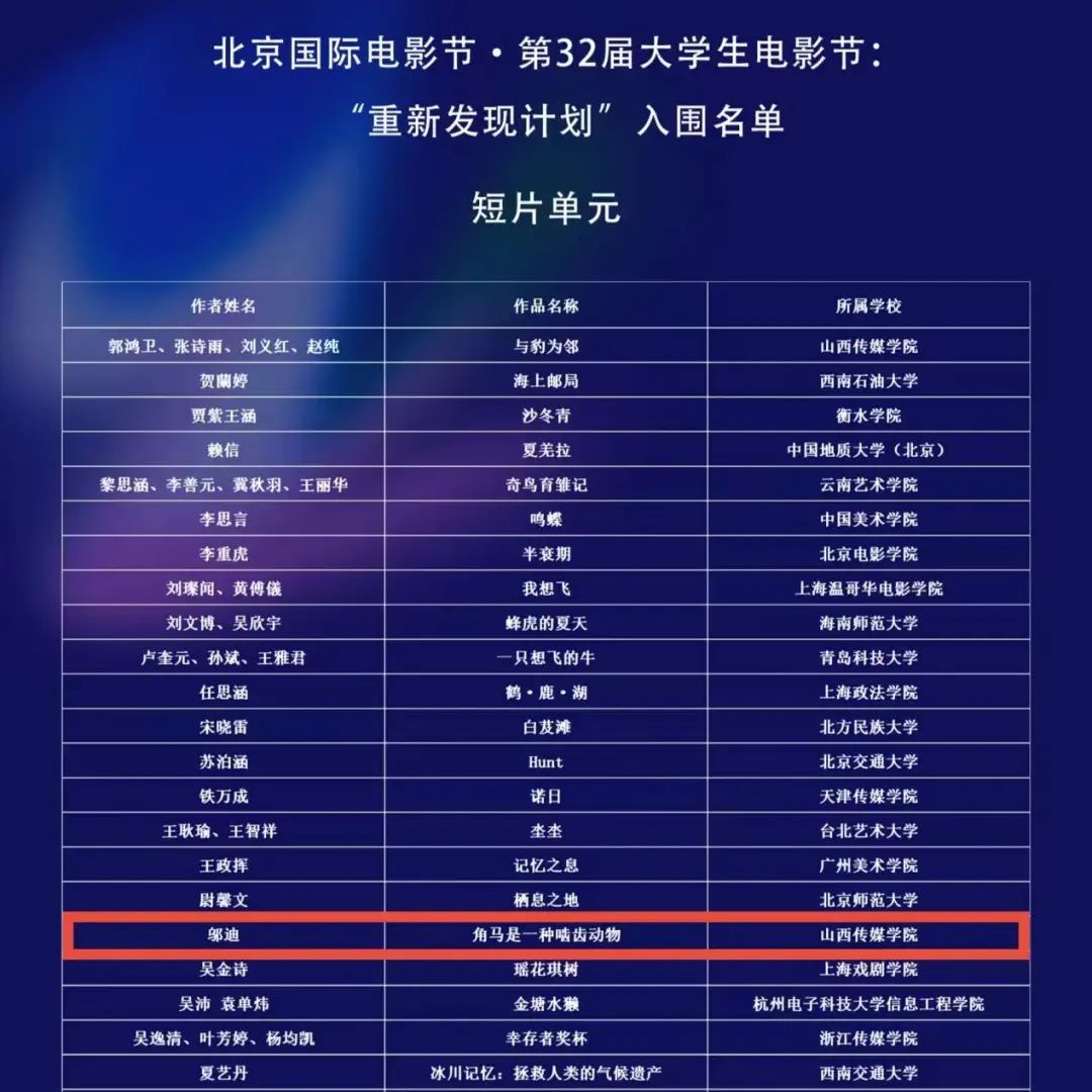 近日,北京国际电影节·第32届大学生电影节“重新发现计划”公布入选名单。热烈庆祝365英国上市公司2022级戏剧影视导演专业邬迪同学的作品《角马是一种啮齿动物》入围第32届大学生电影节“重新发现计划”短片单元。